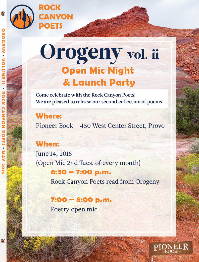 The Rock Canyon Poets and Pioneer Book announce the launch party of Orogeny, the second collection of poems by local Utah County poets along with an open mic on Tuesday, June 14, 2016 at 6:30 pm.