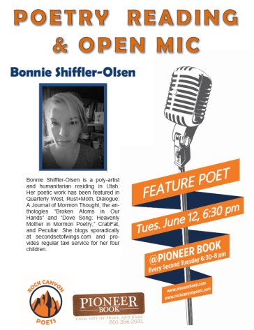 Co-founded by Bonnie Shiffler-Olsen and Trish Hopkinson in 2015, Rock Canyon Poets was established to develop camaraderie among Utah Valley poets, provide consistent workshopping and reading opportunities, and promote the disciplined study of writing poetry as a serious art form. Members meet twice a month at Pioneer Book in historic downtown Provo. The group sponsors poetry readings and an open mic on the 2nd Tuesday of every month. Membership is by invitation or portfolio submission only.