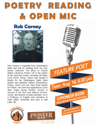 Rock Canyon Poets and Pioneer Book are please to present Utah poet Rob Carney! The event begins with an open mic at 6:30pm and runs until 8:00pm.