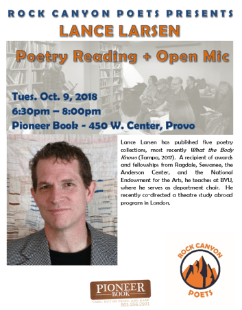 Rock Canyon Poets poetry reading & open mic every 2nd Tuesday at Pioneer Book in Provo, this month on October 9, 2018 from 6:30 – 8:00 pm, featuring Utah poet Lance Larsen.