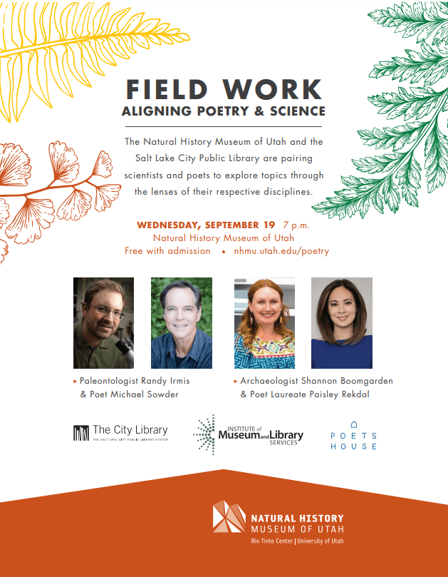Poetry-Science Cafe, Wednesday, Oct. 24, 2018 from 7 – 8 PM. Natural History Museum of Utah in SLC, featuring poets Lance Larsen and Kimberly Johnson.