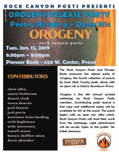 Rock Canyon Poets poetry reading & open mic every 2nd Tuesday at Pioneer Book in Provo, this month on January 8, 2019 from 6:30 – 8:00 pm is the release party for our fourth annual anthology of poems entitled Orogeny. Contributors will read their work and audience members are welcome to read poems during the open mic. Copies of Orogeny will be available for purchase and light refreshments will be served.