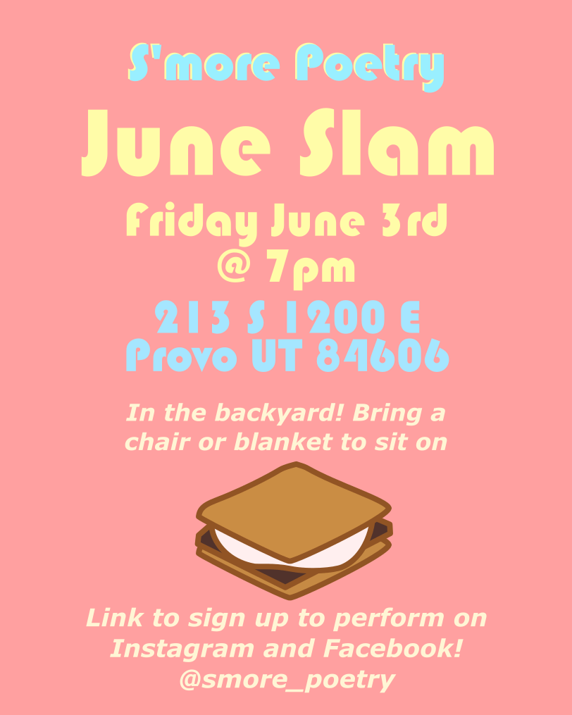 - S’more Poetry is a new poetry slam event the first Friday of every month at 7pm at 213 S 1200 E in Provo in the backyard. Bring a chair or blanket to sit on and you can sign up to perform via Instagram or Facebook.