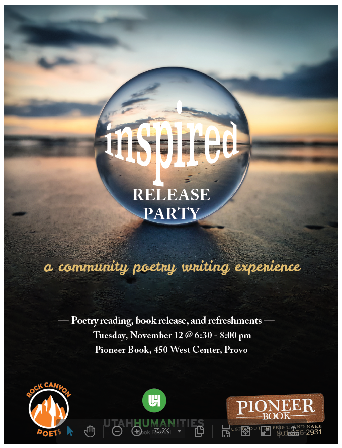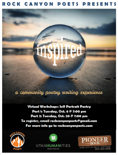 The Rock Canyon Poets, in participation with the Utah Humanities Book Festival, presents “Inspired,” a free community poetry writing workshop offered to Utah residents in October. This year’s theme is Self-Portrait Poems. In this workshop, participants learn how to create poems using writing prompts focused on expression of the self. Offered annually in participation with the Utah Humanities Book Festival by Rock Canyon Poets & Pioneer Book, this workshop is presented in two parts virtual sessions, followed by a virtual poetry reading. Participants are encouraged to submit their poem to be included in a printed anthology and contributors will receive a free copy.