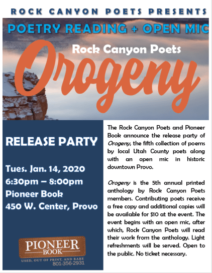 Co-founded by Bonnie Shiffler-Olsen and Trish Hopkinson in January, 2015, Rock Canyon Poets was established to develop camaraderie among Utah Valley poets, provide consistent workshopping and reading opportunities, and promote the disciplined study of writing poetry as a serious art form. Members meet twice a month at Pioneer Book in historic downtown Provo. The group sponsors poetry readings and an open mic on the 2nd Tuesday of every month. Membership is by invitation or portfolio submission only.