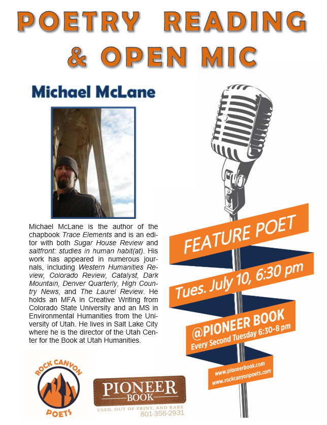 McLane visits Pioneer Book as a guest of the Rock Canyon Poets and Pioneer Book. The reading and open mic are open to the general public.
