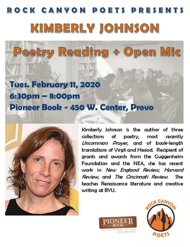 Rock Canyon Poets and Pioneer Book are please to present Utah poet Kimberly Johnson. The event begins with an open mic at 6:30pm and runs until 8:00pm at Pioneer Book (450 W. Center) in historic downtown Provo on Tuesday, February 11, 2020. Johnson will read her work and present a poetry writing prompt.